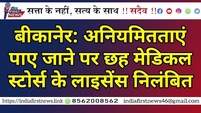 बीकानेर, 2 मई। जांच के दौरान विभिन्न अनियमितताएं पाए जाने पर छह मेडिकल स्टोर्स के अनुज्ञापत्र निलम्बित किए गए हैं।